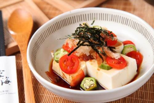 Japanese chilled tofu izakaya dish topped with katsuobushi, green onions, grated ginger and season with a little bit of soy sauce.