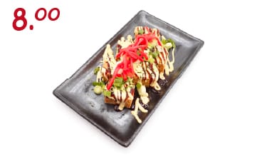 Deep-fried tofu topped with okonomi sauce, Japanese mayo, aonori flakes, green onions, and pickled ginger for a delicious fusion of flavors!